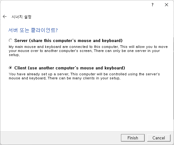 - 서버를 체크하면 해당 PC를 메인 설정으로 다른 연결된 클라이언트 PC에 키보드 마우스가 공유됨