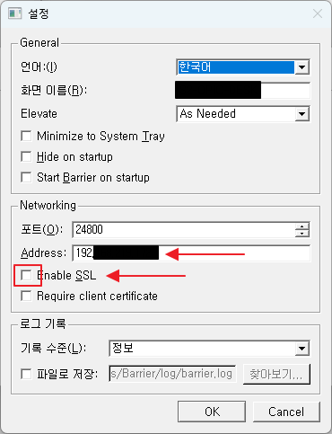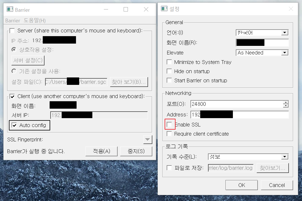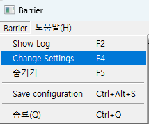 - Barrier의 설정 화면에 있는 Show Log를 통해 실제 동작 상태와 연결 상태등을 확인 할수 있음