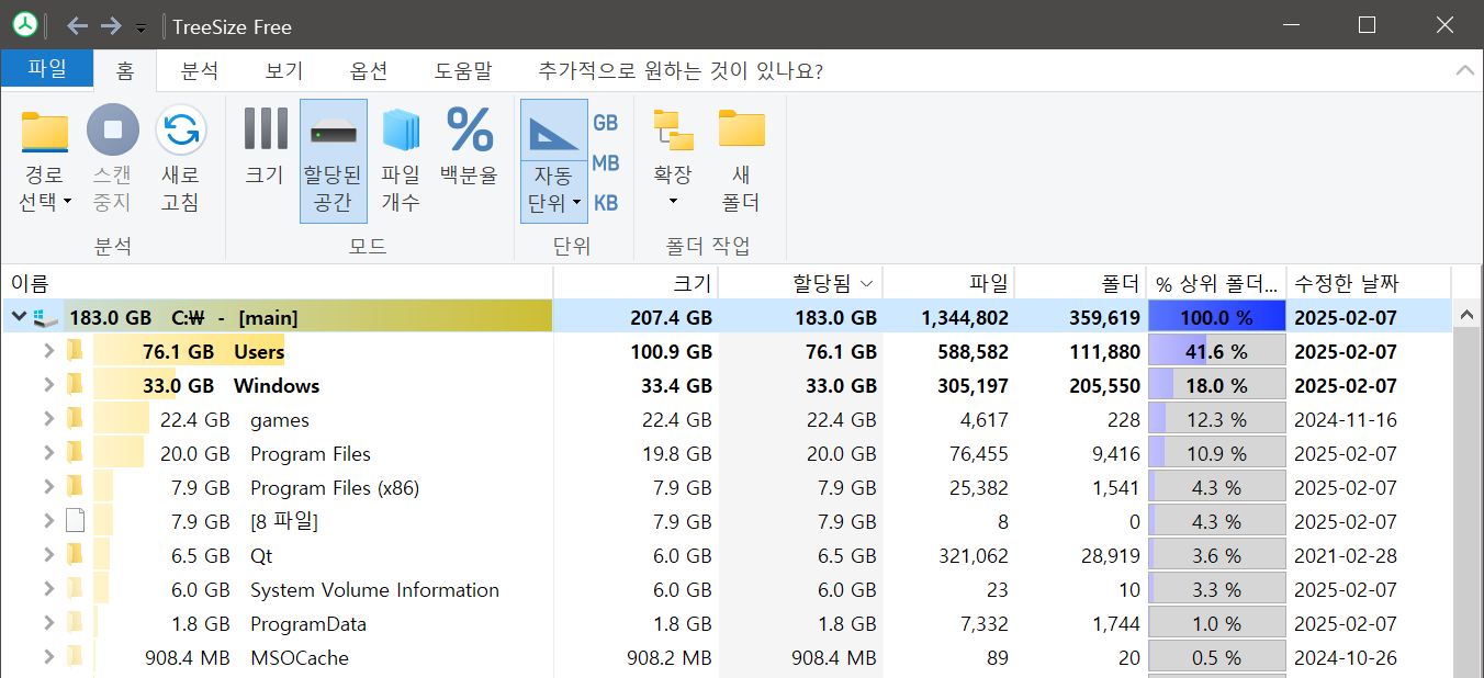 윈도우가 깔린 드라이브에 어떤 폴더, 어떤 파일이 가장 용량을 많이 차지 하고 있어?!
