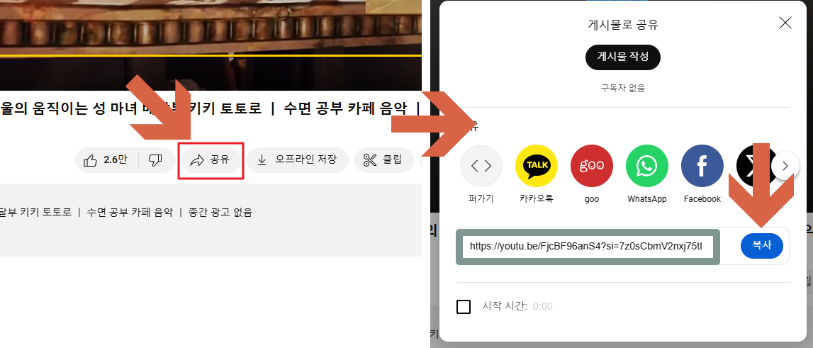 유튜브에서 동영상 공유를 눌러 URL을 복사 한 후에