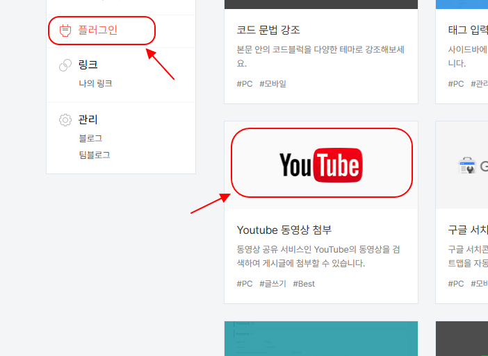 - 블로그 관리 페이지에서 유튜브 플러그인 추가하기