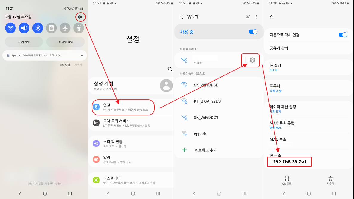 - 일단 안드로이드 기기에서 WIFI 연결된 상태에서 기기의 IP를 확인 합니다.