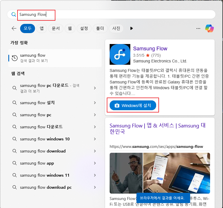 - 다음으로 PC 윈도우의 시작 버튼을 누른 후 "samsung flow" 를 타이핑하여 삼성 플로우 검색