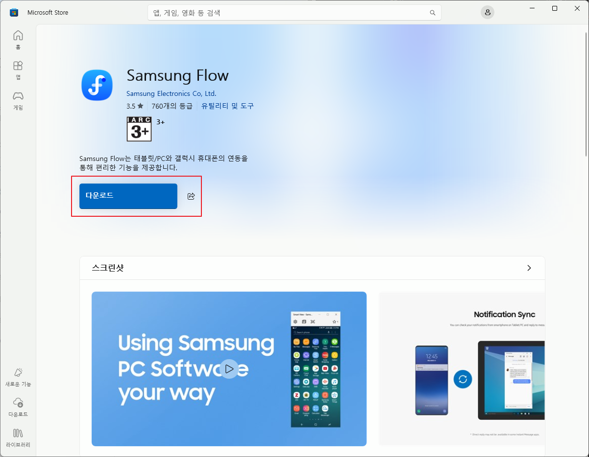 - 다운로드를 눌러 삼성플로우 설치