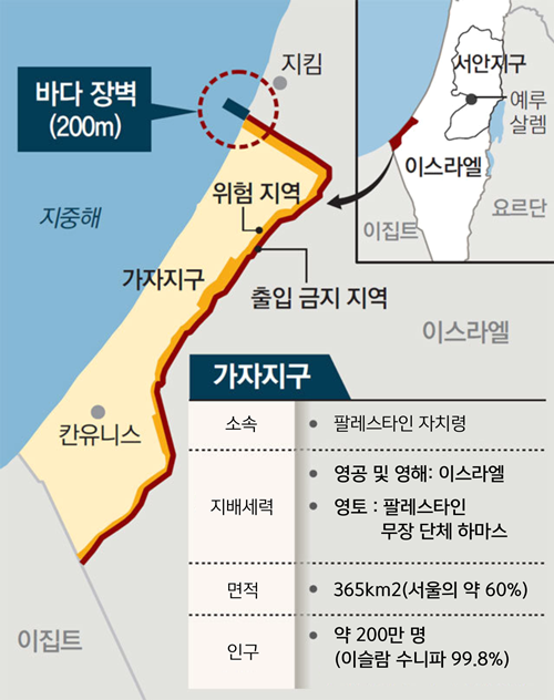 가자 지구는 지중해 연안에 위치해 있으며, 면적은 약 365㎢로 서울의 약 60%에 해당합니다. 이 지역은 북쪽으로 이스라엘과 접하고 있으며, 동쪽과 남쪽은 이집트와 경계를 이루고 있습니다. 가자 지구는 인구가 약 200만 명에 달하며, 이 지역의 정치적 지배자는 하마스입니다.