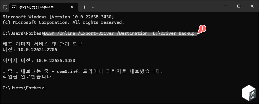 - 드라이버 백업 명령어 입력 : 다음 명령어를 입력합니다.이 명령어를 통해 드라이버가 지정한 경로에 백업됩니다.