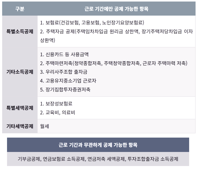 근무 기간에 따라 공제 받을 수 없는 항목이 있습니다. 예를 들어, 연말 정산에서 주택자금 공제나 신용카드 사용액 공제는 연중 내내 고용이 유지되어야 하므로, 중도 퇴직자는 이에 대한 공제를 받을 수 없습니다.