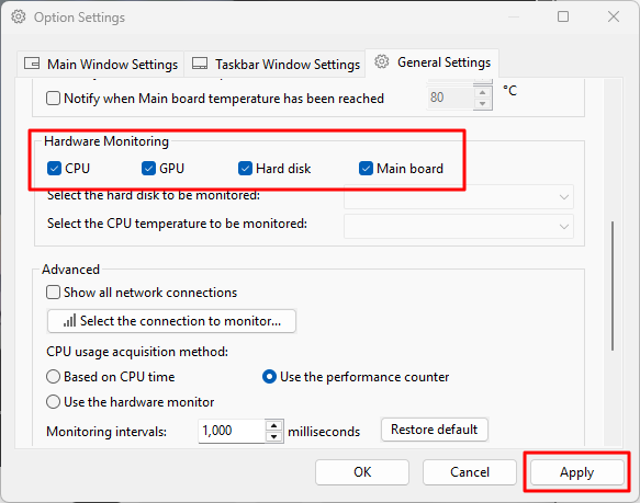 [Hardware Momitoring] 부분에서 CPU, GPU, Hard disk, Main board 체크 후 Apply 선택합니다.