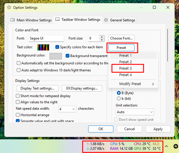 [Taskbar Window Settings] 탭에 [Preset] 을 선택 후