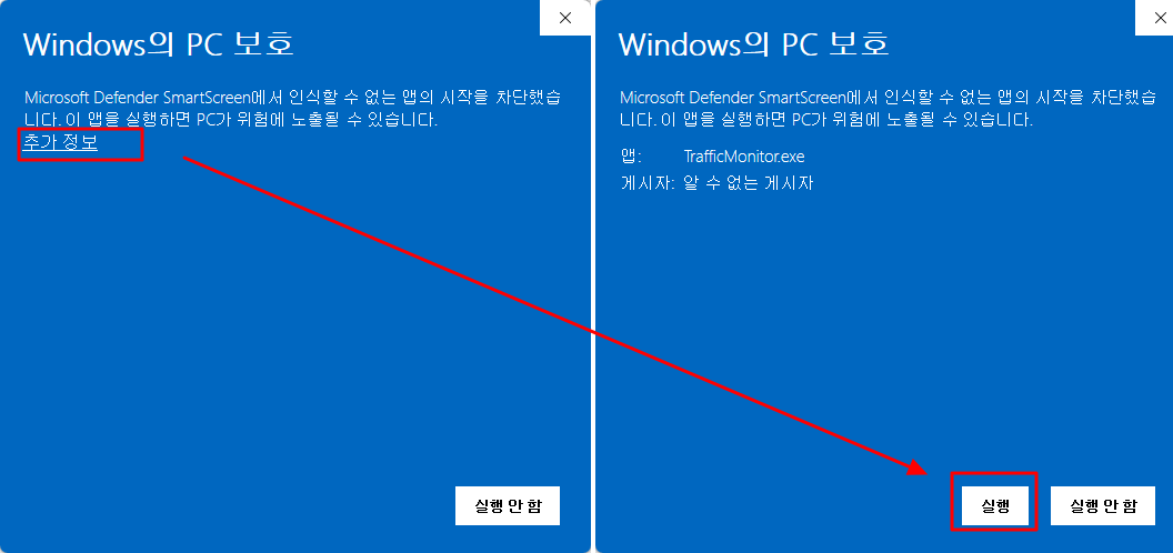 비 설치 비인가 파일이라 보호 팝업이 발생하지만 위와 같이 하여 실행합니다.