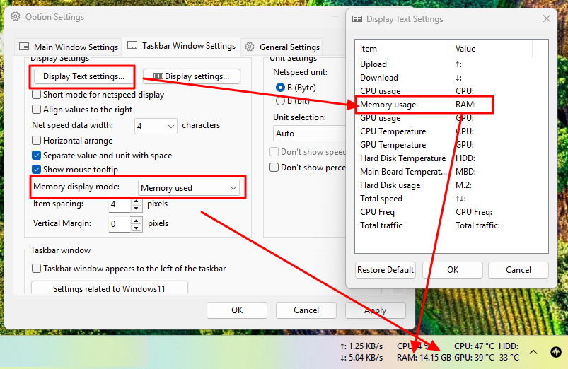 Display settings... 을 선택 후 필요한 항목( CPU, Memory 사용량 + 온도) 을 선택후 적용을 선택하면