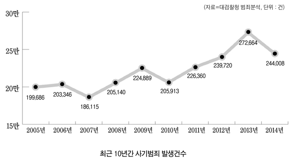 최근 10년간 한국에서의 사기 사건 수를 살펴보면, 정말 놀라운 수치가 나와요. 2005년부터 2014년까지의 통계를 보면, 사기 사건 수가 꾸준히 증가하는 추세를 보였어요. 특히 2013년에는 272,664건으로 정점을 찍었고, 이후에는 조금 줄어들긴 했지만 여전히 높은 수치를 유지하고 있답니다.