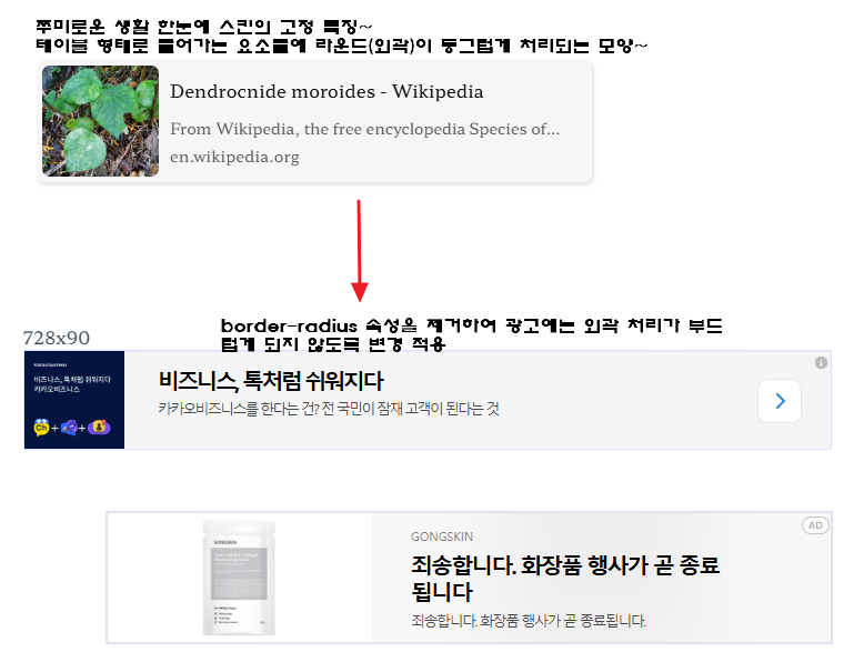 위 적용 화면에서와 같이 광고 외곽의 둥글게 처리하는 부분이 제거된 화면을 확인 할 수 있습니다.