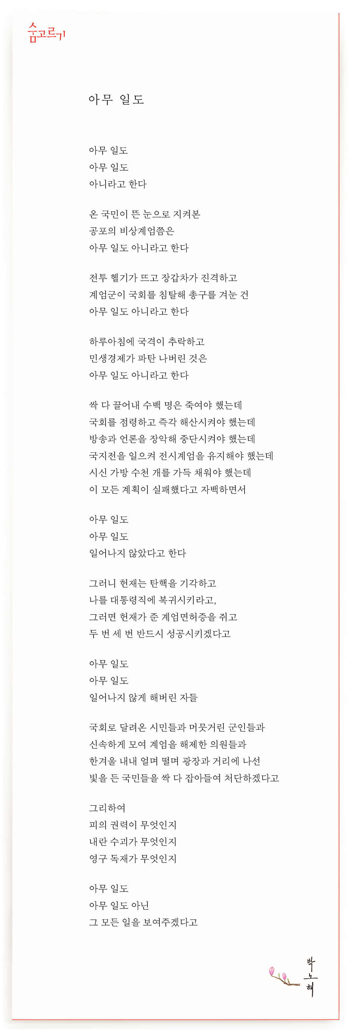 아무 일도/아무 일도/아니라고 한다//온 국민이 뜬 눈으로 지켜본/공포의 비상계엄쯤은/아무 일도 아니라고 한다//전투 헬기가 뜨고 장갑차가 진격하고/계엄군이 국회를 침탈해 총구를 겨눈 건/