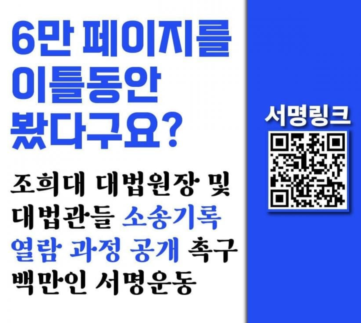 [“조희대 대법원장 및 대법관들의 6만 페이지 이틀 열람” 소송 기록 열람 과정 등 공개 촉구 백만인 서명운동] ❤️🔥 비상입니다! ❤️🔥 서명 독려해주시고 대법원의 간악한 짓을 잘