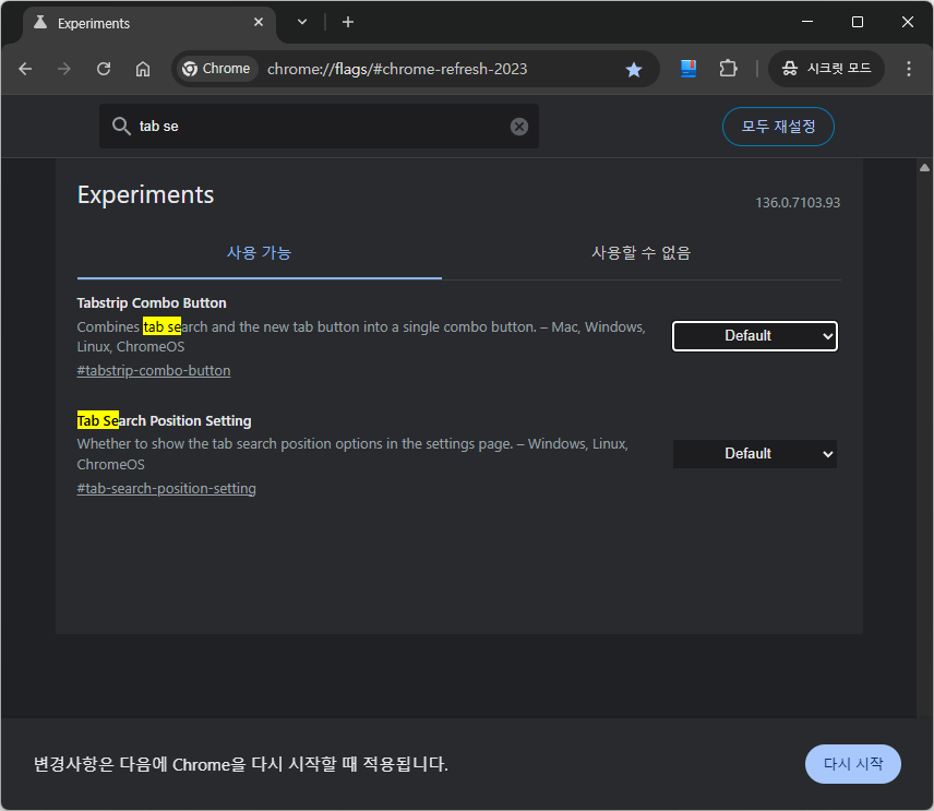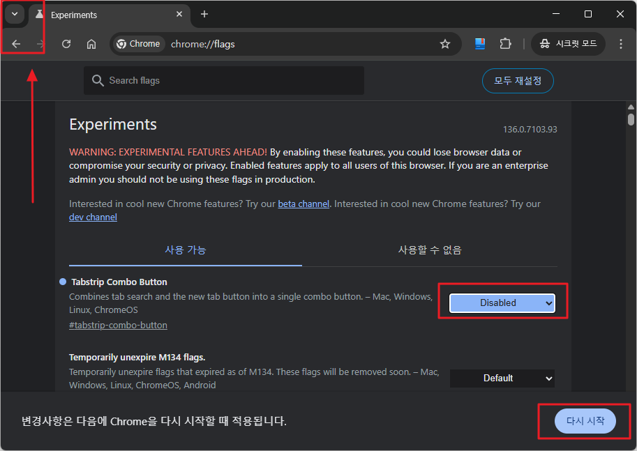 tab search를 검색하여 Default로 되어 있는 항목을 Disable로 변경하고 다시 시작 합니다.