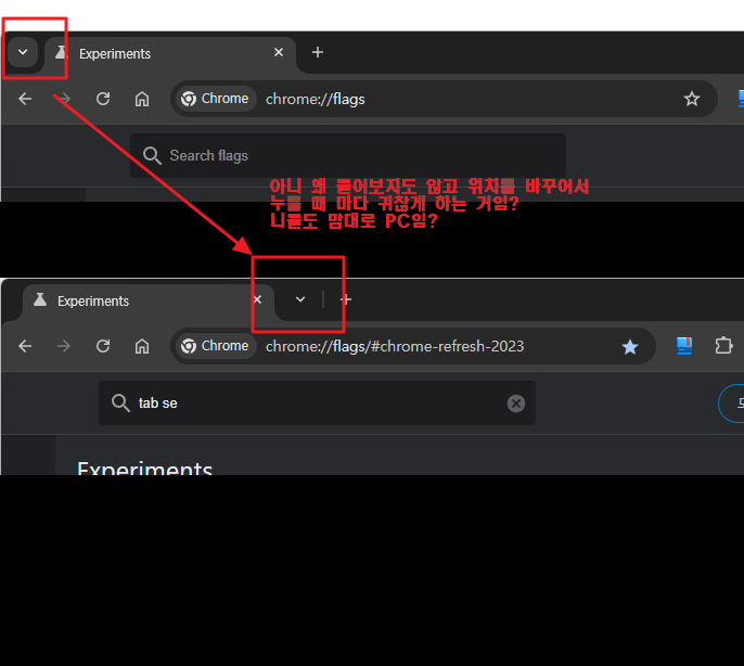 잘 사용하던 어느날 갑자기 바뀌어 버린 크롬 화면 상단의 탭 메뉴 위치.