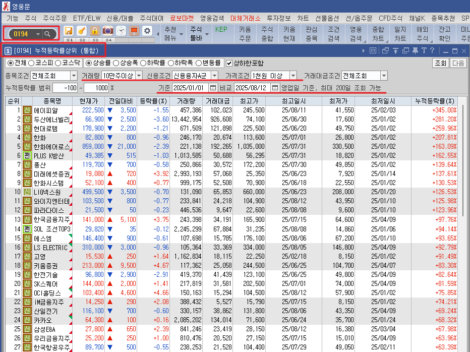 보다 나은 선별? 을 위해서는 붉은색 라인 부분의 거래량, 신용 조건, 가격 조건,