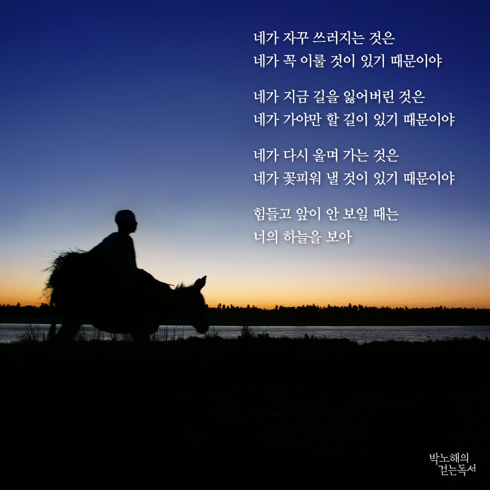 네가 자꾸 쓰러지는 것은 네가 꼭 이룰 것이 있기 때문이야 네가 지금 길을 잃어버린 것은 네가 가야만 할 길이 있기 때문이야 네가 다시 울며 가는 것은 네가 꽃피워 낼 것이 있기 때문이야 힘