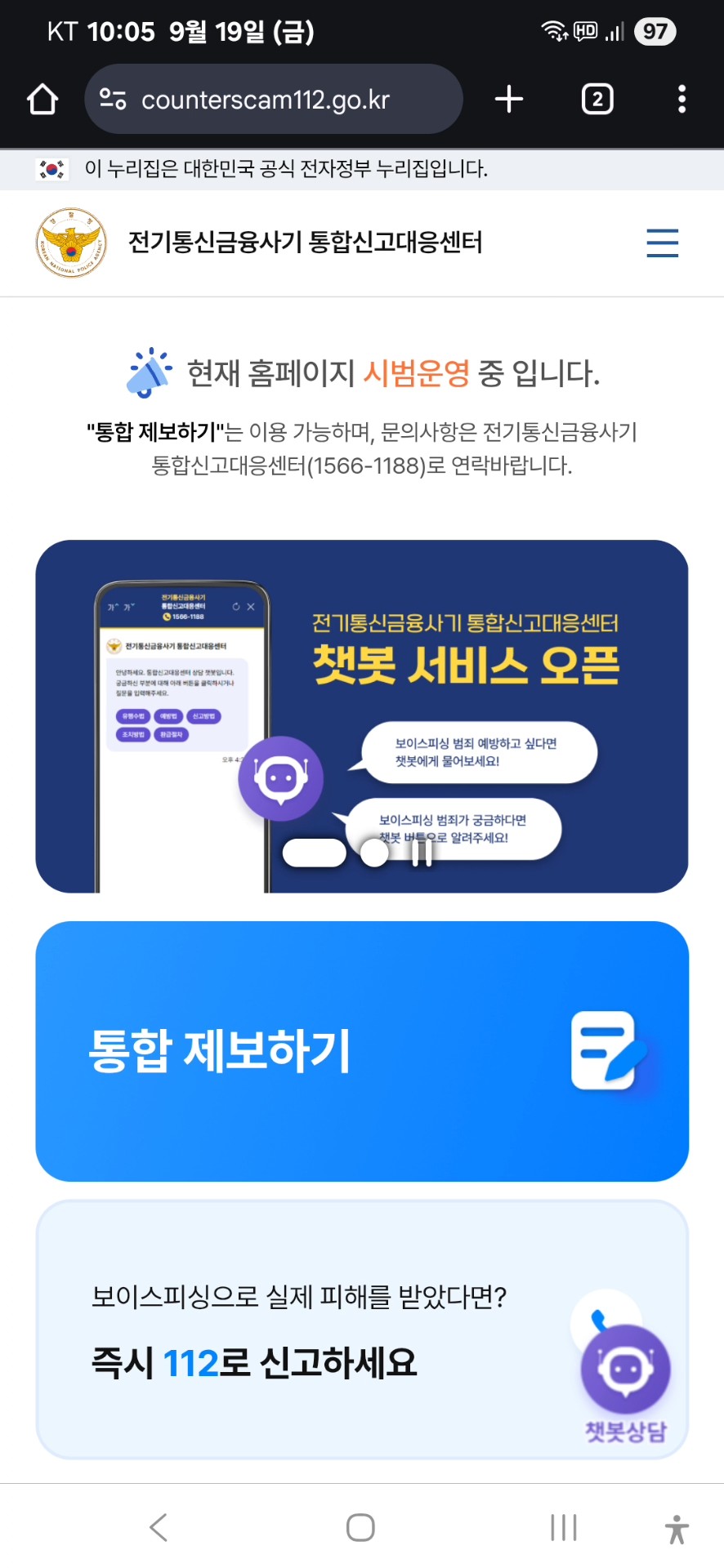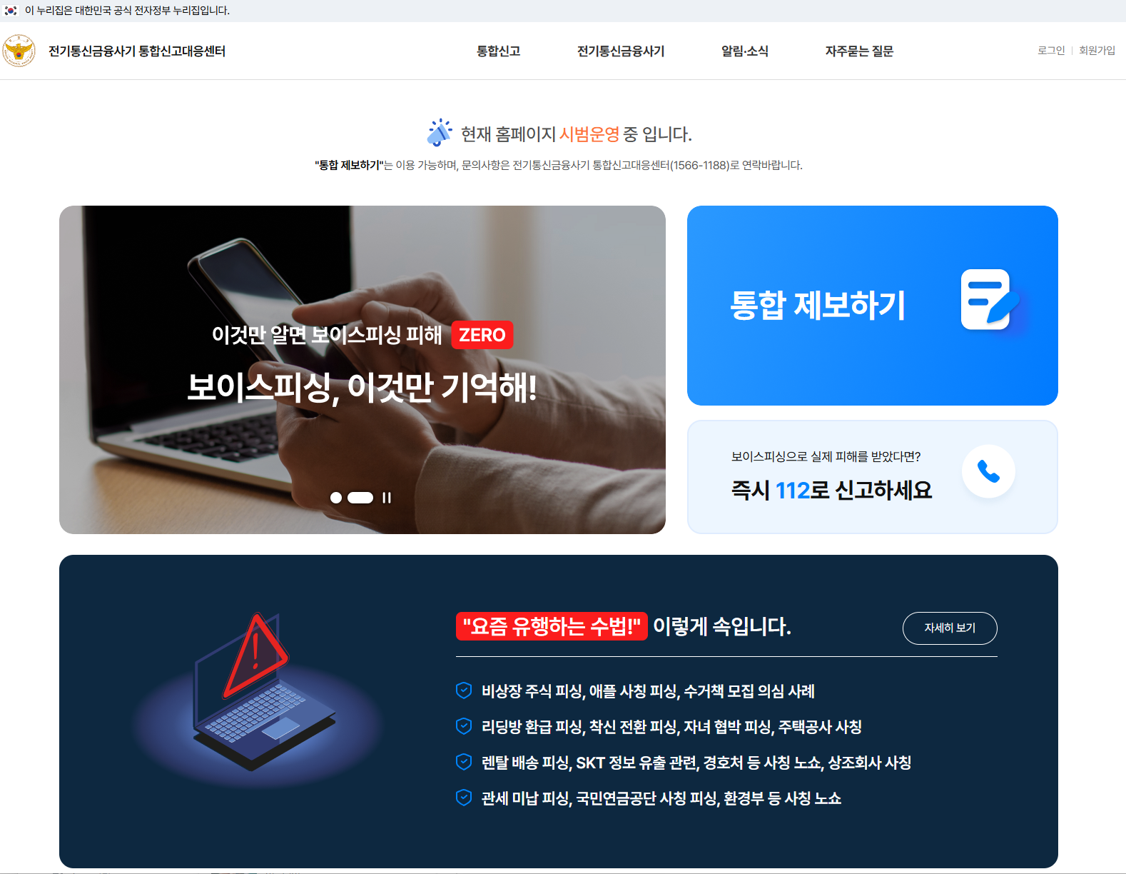 - 신고 접수: 보이스 피싱 제보, 발신번호 거짓 표시, 스미싱 등 사기 행위 신고를 통합 처리합니다.