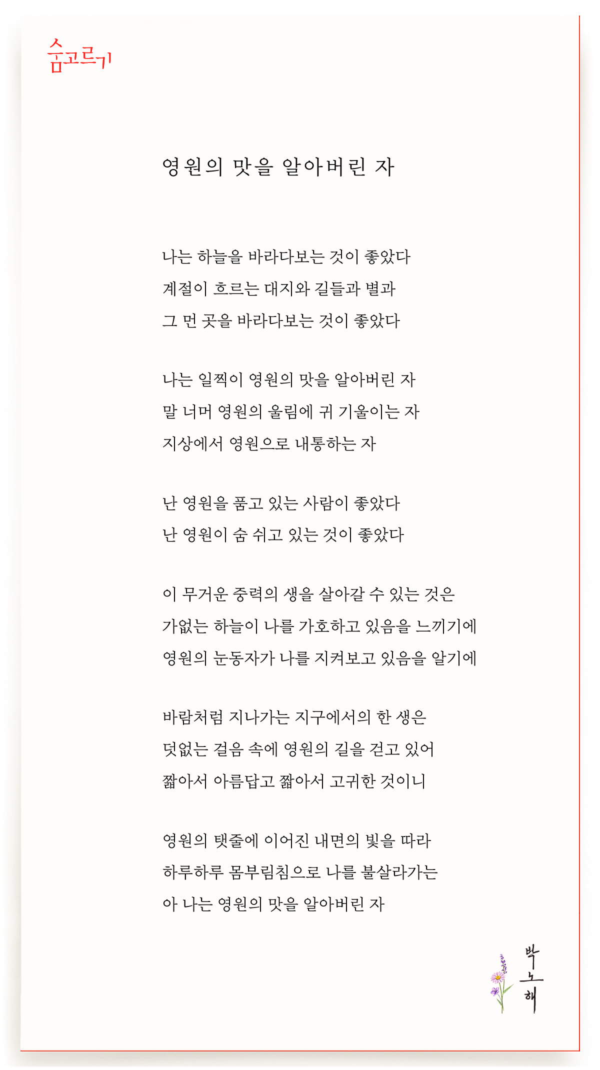 나는 하늘을 바라다보는 것이 좋았다/계절이 흐르는 대지와 길들과 별과/그 먼 곳을 바라다보는 것이 좋았다//나는 일찍이 영원의 맛을 알아버린 자/말 너머 영원의 울림에 귀 기울이는 자/지상