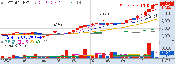 - 키움투자자산운용에서 운영하는 KIWOOM KRX100 ETF는 이 지수를 추종