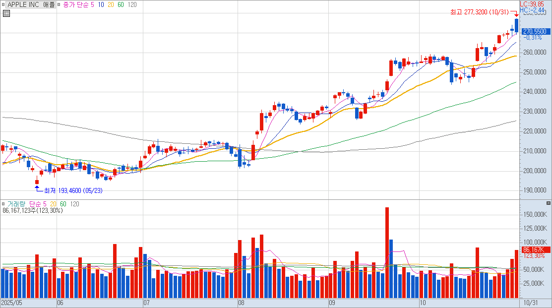 - 10월 31일, 애플 주가가 기존 최고가인 277.32달러
